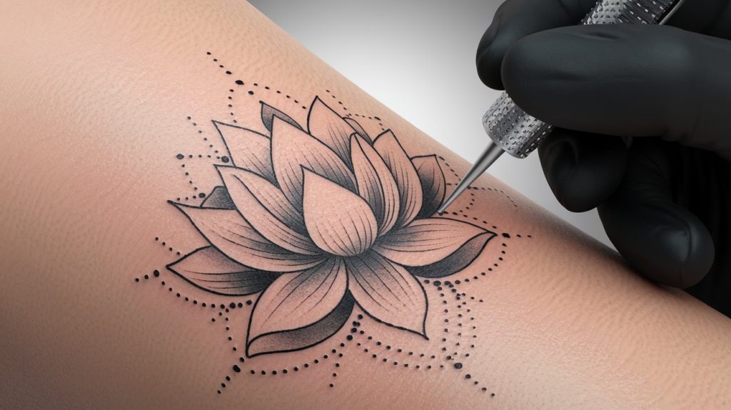 Le style géométrique moderne intègre des formes mandala autour du lotus, créant une harmonie visuelle saisissante. Cette approche plaît particulièrement aux amateurs de tatouage lotus mandala qui recherchent l’harmonie sacrée dans leur design.