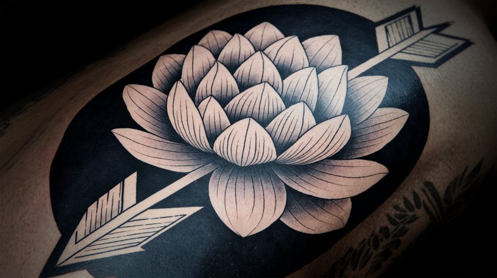 La fleur de lotus tatouage incarne la renaissance et la pureté. Enracinée dans la boue mais s’épanouissant vers la lumière, elle symbolise la capacité à surmonter les épreuves pour atteindre l’illumination. Cette dualité entre ancrage terrestre et élévation spirituelle fait écho au symbolisme de la flèche qui traverse les obstacles.