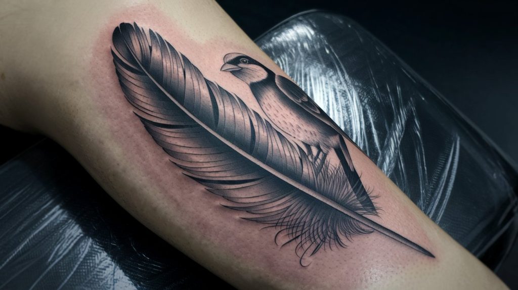 Le tatouage plume femme se caractérise par des lignes plus fines et des détails minutieux. Les femmes choisissent souvent des plumes d’oiseaux délicats comme le colibri ou l’hirondelle, symbolisant la grâce et la liberté féminine. Cette signification tatouage plume femme s’enrichit fréquemment d’éléments floraux ou de motifs géométriques subtils.